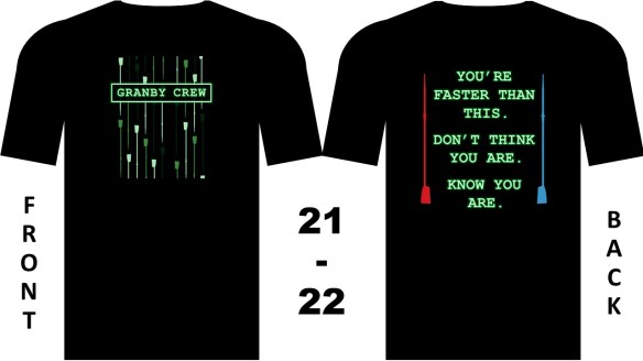 The team shirt is a yearly tradition at Granby Crew. There’s only one way to earn it… competition. Coaches and athletes wear the shirt, having done the work to be ready to race, and then following through on that work. You don’t get the shirt when you join; you get it soon before a race (hopefully your first).